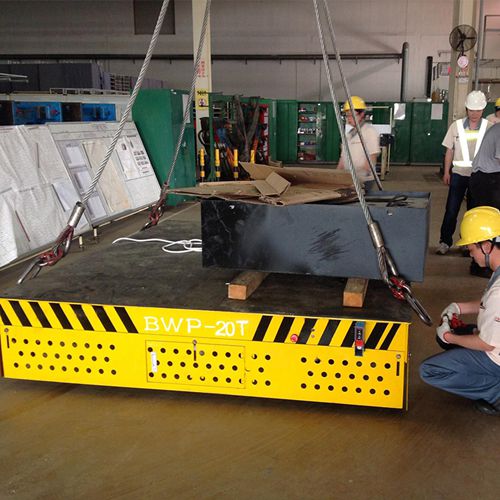 客戶需要在1號車間和2號車間廠房進行往返運行,在1號車間用重型吊車吊起模具然后放置在無軌模具車上,然后通過無軌模具車在運輸?shù)?號車間,進行下面的流程,運輸距離大致在50米左右,我們?yōu)榭蛻袅可矶ㄖ颇>咿D(zhuǎn)運車是我公司一款BWP20t 產(chǎn)品,該模具平板車具有操作靈活,360度無死角防護、遇人自動停止等功能,既保證了車間人員的安全,又輕盈便捷將繁重的模具搬運至目的地.