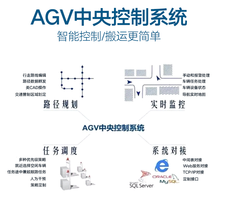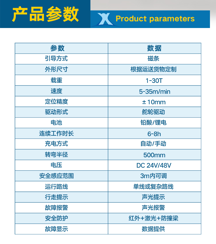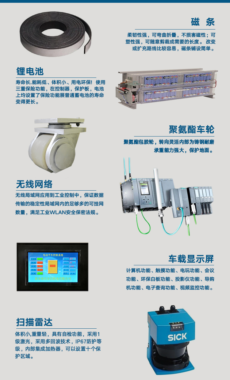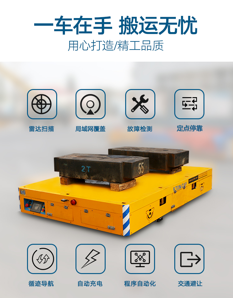 AGV重載磁條引導平車是一種以電池作為電源,舵輪作為驅動系統(tǒng),磁條作為輔助,其運行不受限制,可以根據(jù)需求自動化對位,輥輪傳送,頂升,臺面旋轉等功能,載重能力1-30噸